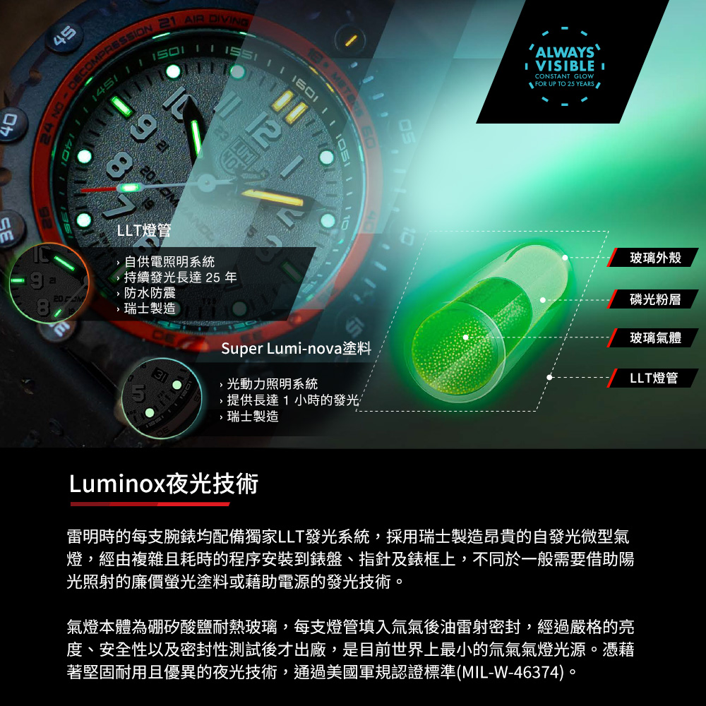 堅固耐用總重卻僅有46公克!錶框12點鐘方向定位點,彩色微型發光燈管,更強化了易讀性,無論何時皆能提供最精準的計時—Always Visible!