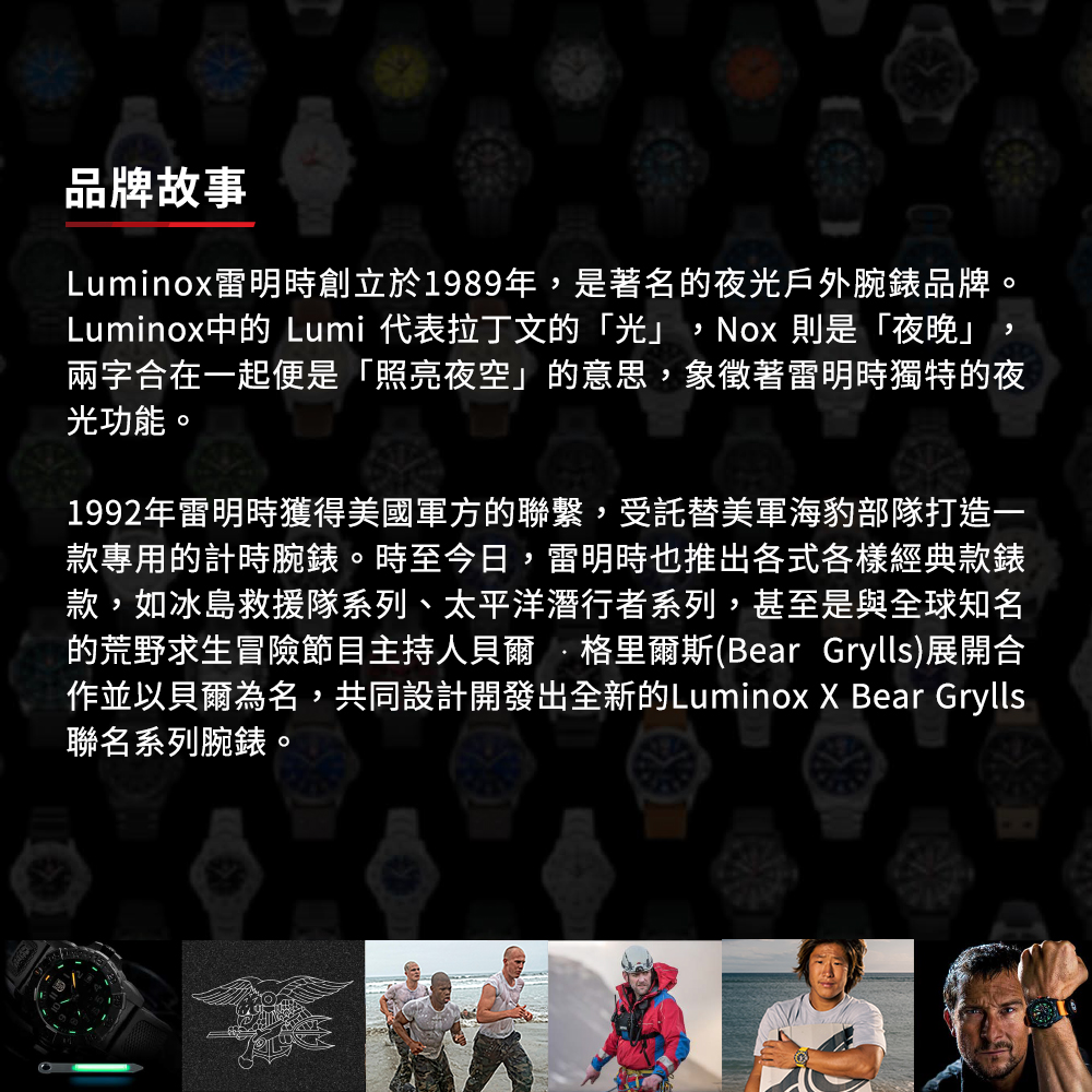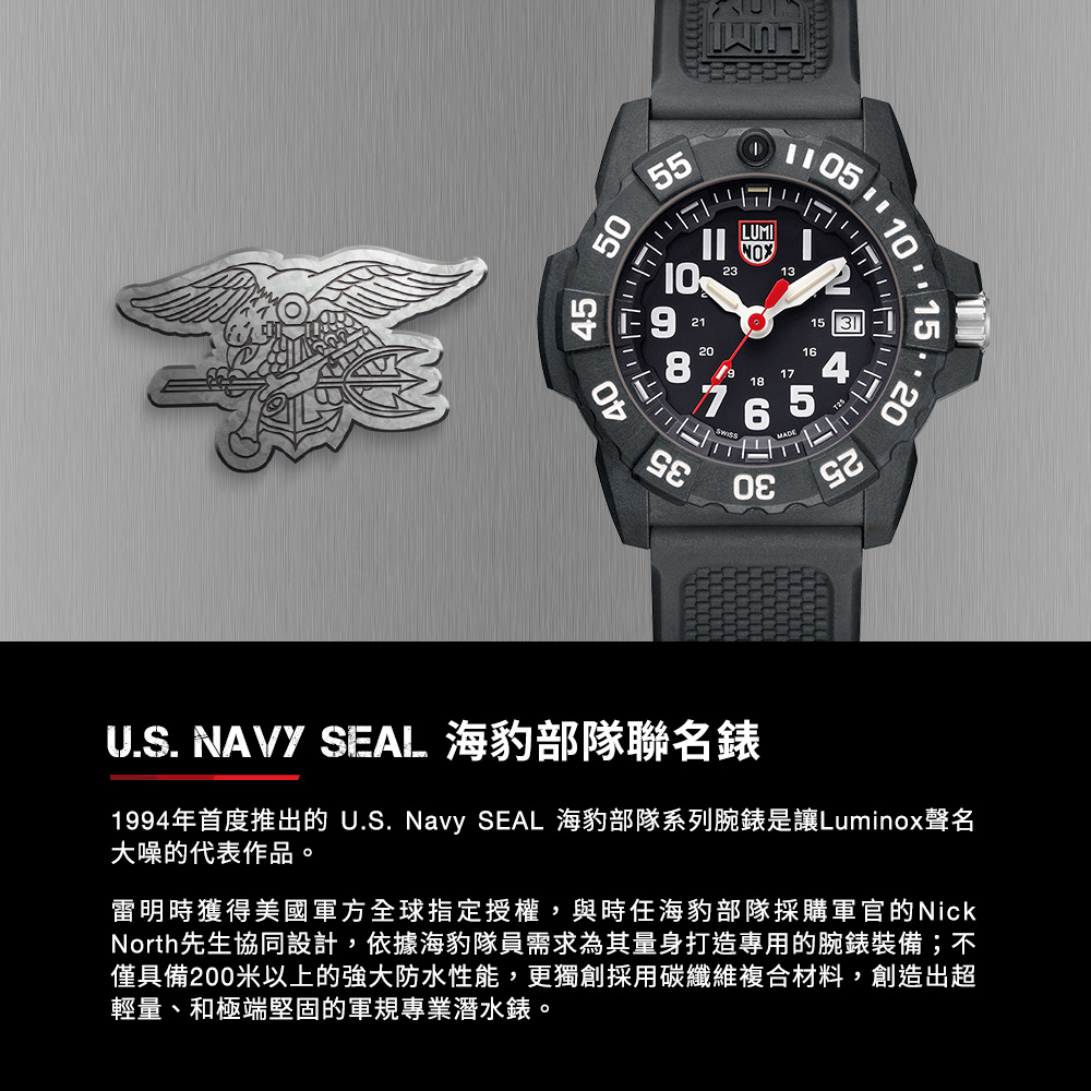 唯有無論處在沙漠、叢林、海洋各種極限環境下皆100%清晰可見、防水耐用的LUMINOX雷明時能成為海豹菁英於阿富汗戰爭、美伊戰爭、獵殺賓拉登等重要戰役不可或缺的伙伴!腕表背蓋上刻有U.S. Navy SEAL海豹三叉戟軍徽,不僅代表得到美軍認可授權,也象徵著配戴者如同海豹菁英一般,勇於面對各種工作任務的挑戰精神!