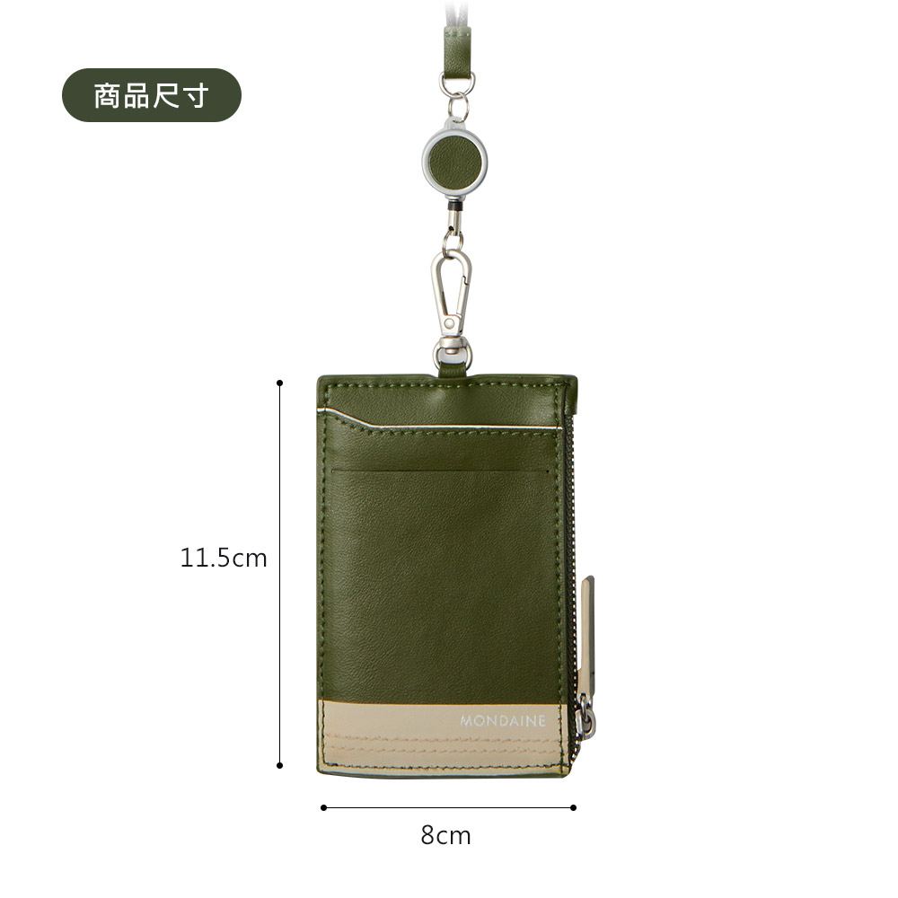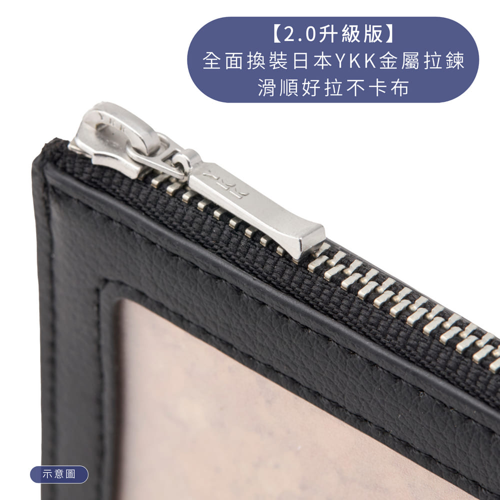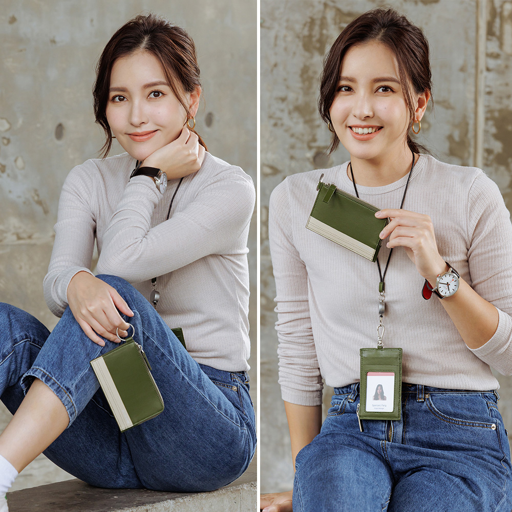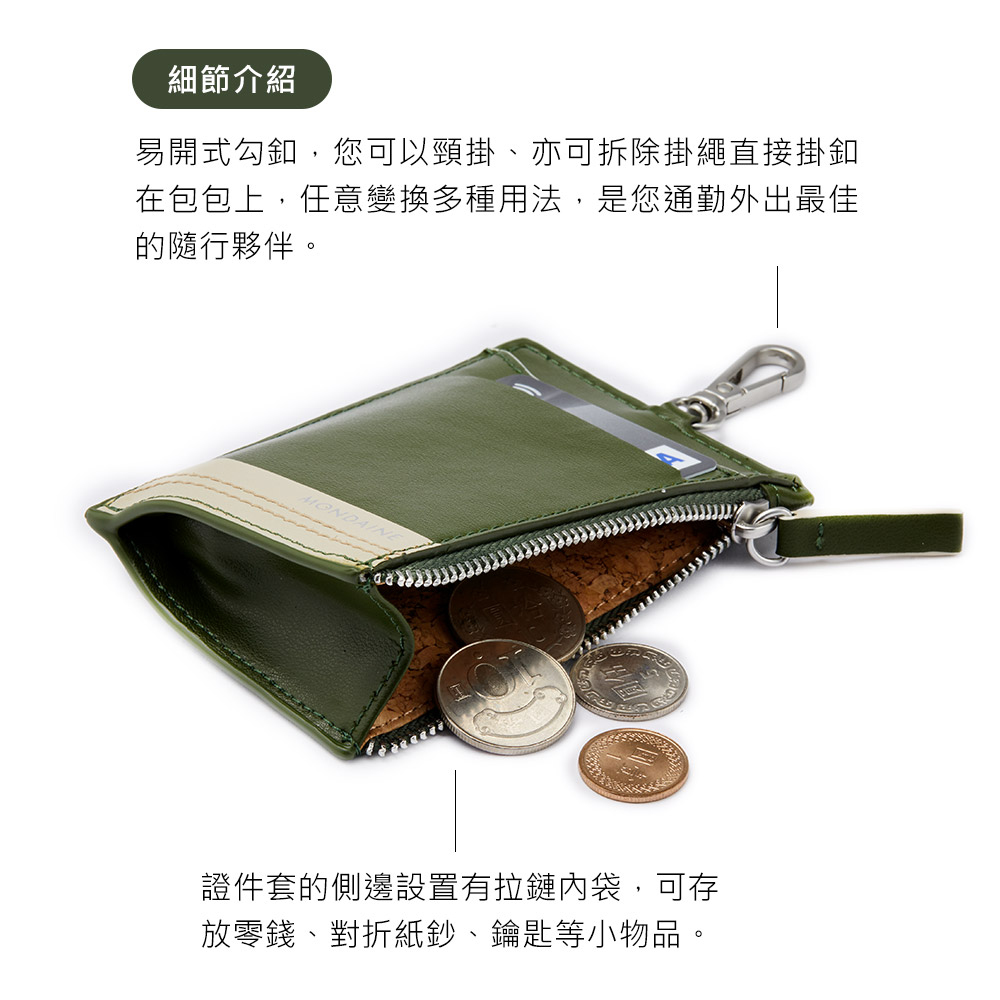 證件套正反兩面共可容納2張卡片,可放入您常用的悠遊卡/一卡通、門禁感應卡、或名片等物品。證件套的側邊設置有拉鏈內袋,可存放零錢、對折紙鈔、鑰匙等小物品。