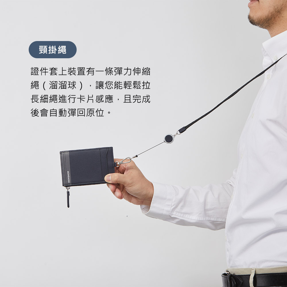 證件套上裝置有一條彈力伸縮繩(溜溜球),讓您能輕鬆拉長細繩進行卡片感應,且完成後會自動彈回原位。此外,溜溜球上方附有易開式勾釦,您可以頸掛、亦可拆除掛繩直接掛釦在包包上,任意變換多種用法,是您通勤外出最佳的隨行夥伴。