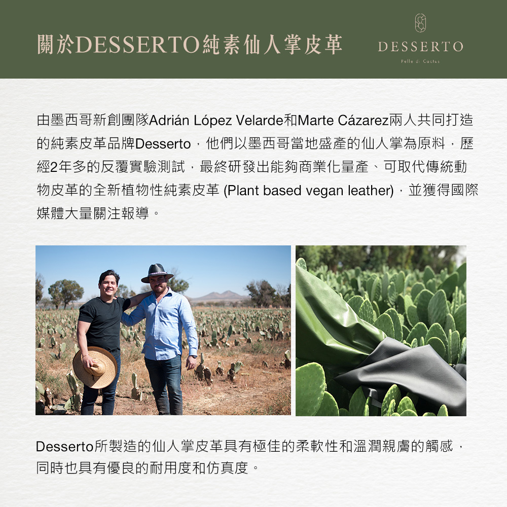 由墨西哥新創團隊DESSERTO所生產的植物皮革,以墨西哥當地盛產的仙人掌為原料,透過加工處理製作成為100%不含任何化學毒素、不含動物製品、且能夠生物分解的純素植物皮革(Vegan Leather)。此外,它也具有柔軟親膚、耐用的優異特性,更帶著甜甜的自然香氣。