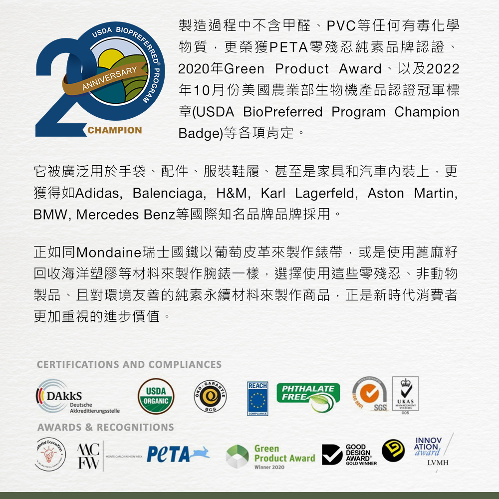 正如同Mondaine瑞士國鐵以葡萄皮革來製作錶帶,或是使用蓖麻籽、回收海洋塑膠等材料來製作腕錶一樣,選擇使用這些零殘忍、非動質製品、且對環境友善的純素永續材料來製作商品,正是新時代消費者更加重視的進步價值。