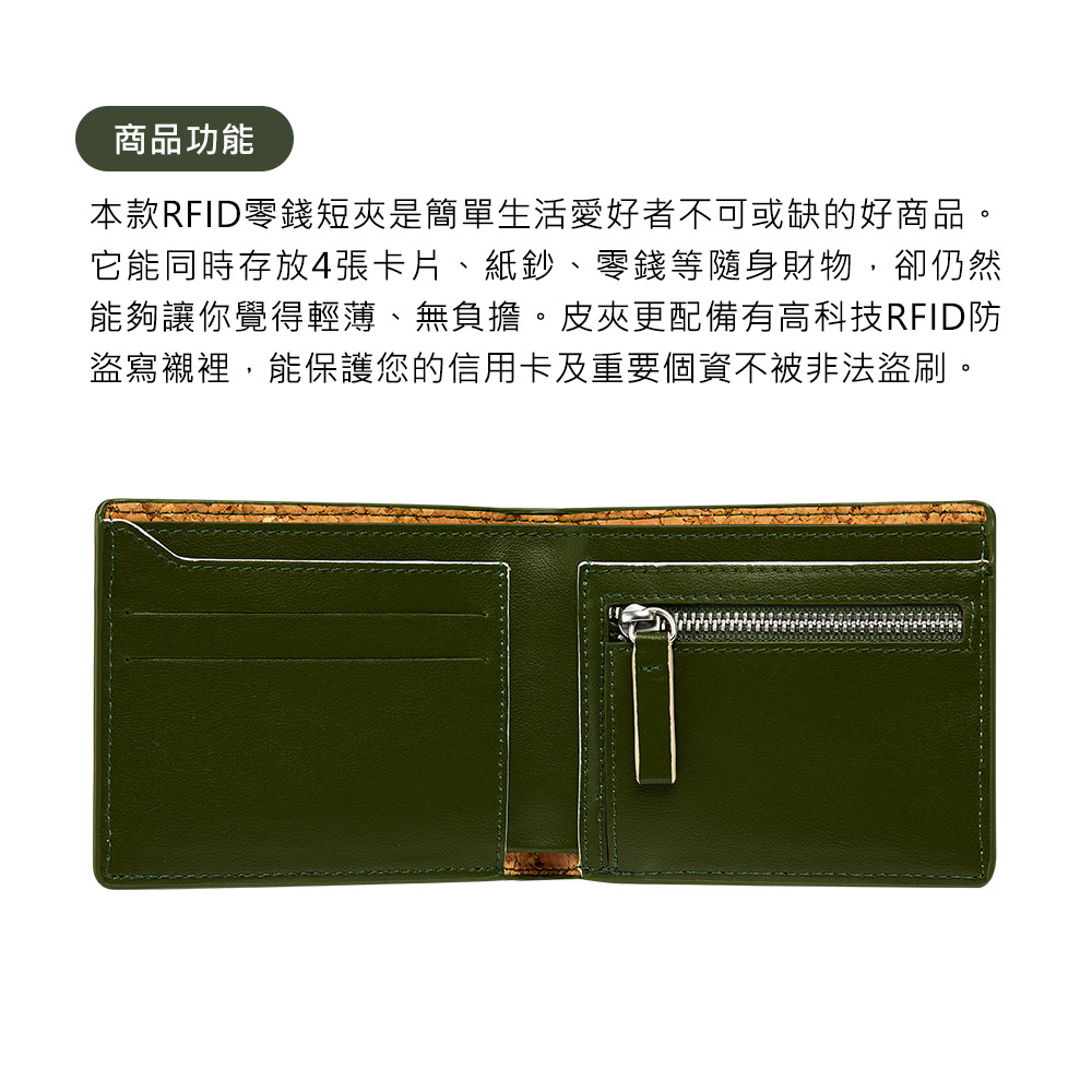 本款RFID零錢短夾是簡單生活愛好者不可或缺的好商品。它能同時存放4張卡片、紙鈔、零錢等隨身財物,卻仍然能夠讓你覺得輕薄、無負擔。皮夾更配備有高科技RFID防盜寫襯裡,能保護您的信用卡及重要個資不被非法盜刷。