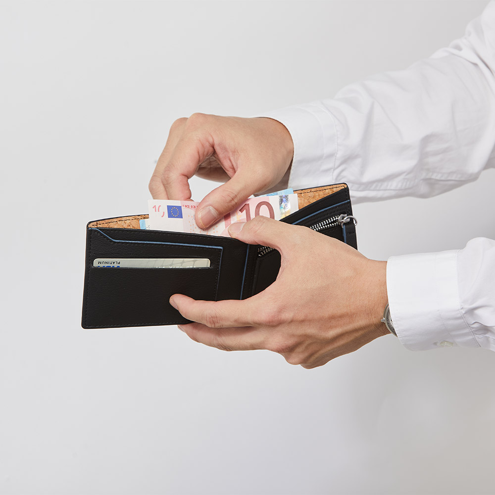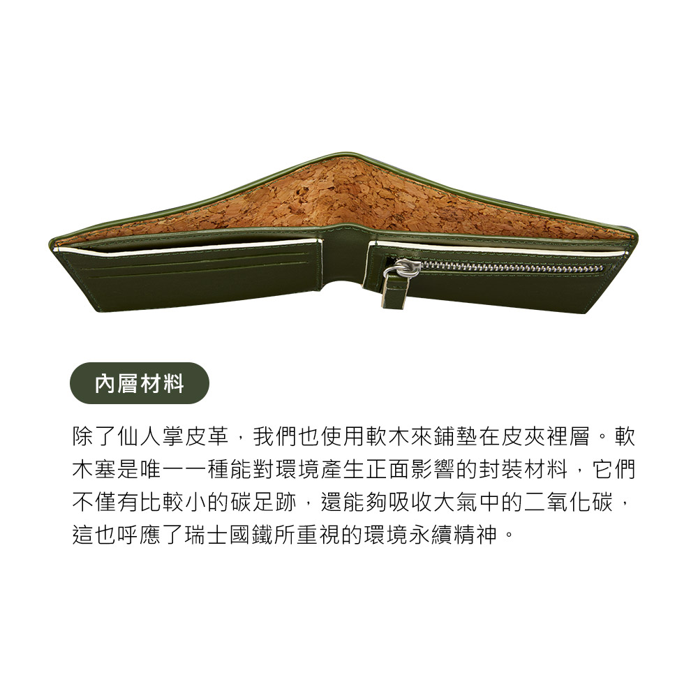 除了仙人掌皮革,我們也使用軟木來鋪墊在皮夾裡層。軟木塞是唯一一種能對環境產生正面影響的封裝材料,它們不僅有比較小的碳足跡,還能夠吸收大氣中的二氧化碳,這也呼應了瑞士國鐵所重視的環境永續精神。