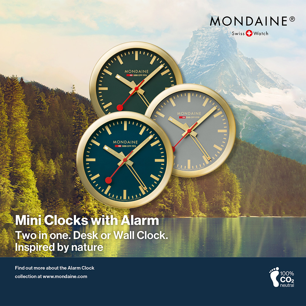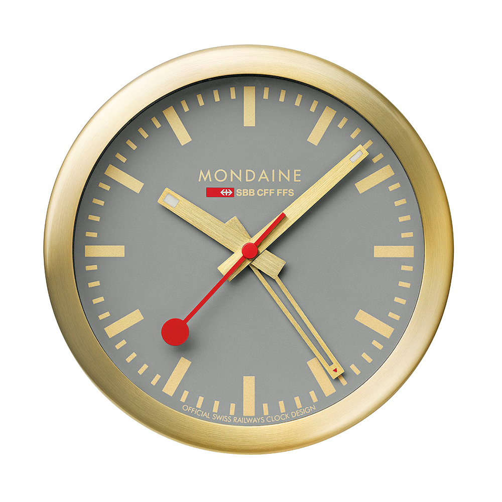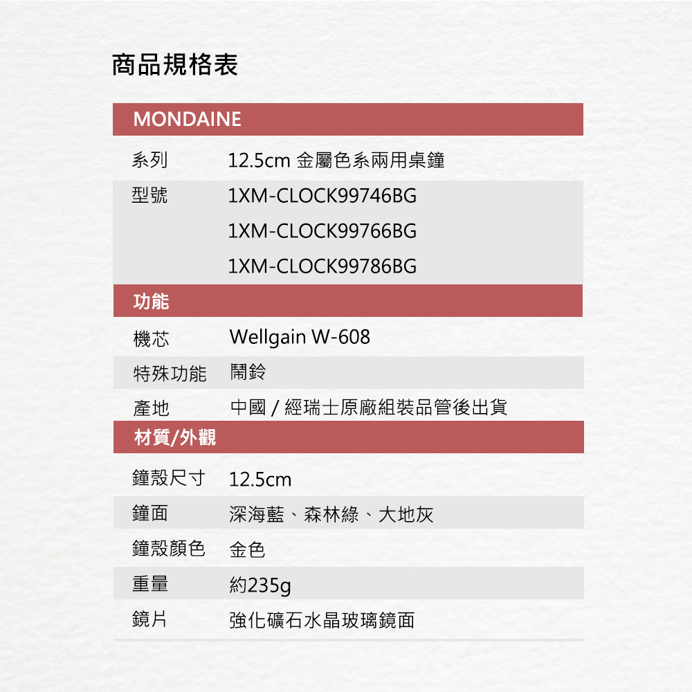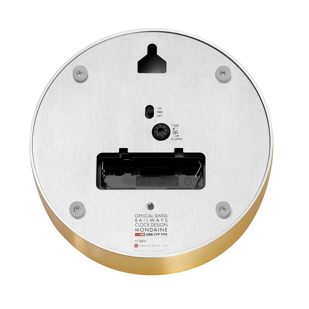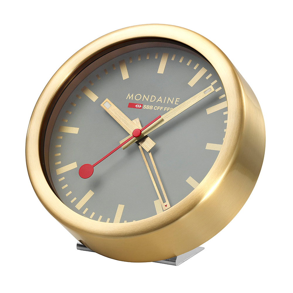MONDAINE 瑞士國鐵兩用鬧鐘,一貫清楚易讀的鐘面設計,附有鬧鈴功能。恰好的尺寸,可以懸掛在面積較小的牆柱或房間,或使用隨附的L型鋁合金支架,立於桌面作為桌鐘使用,時時刻刻給您最準確的計時。