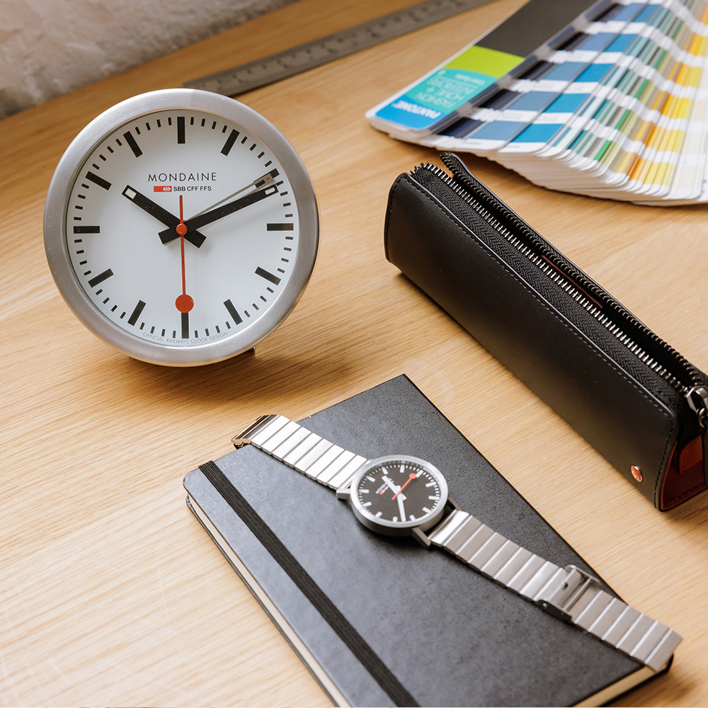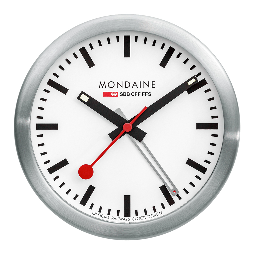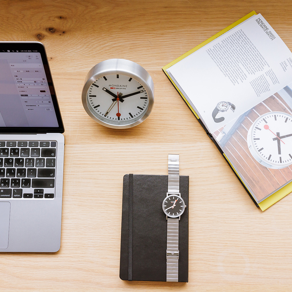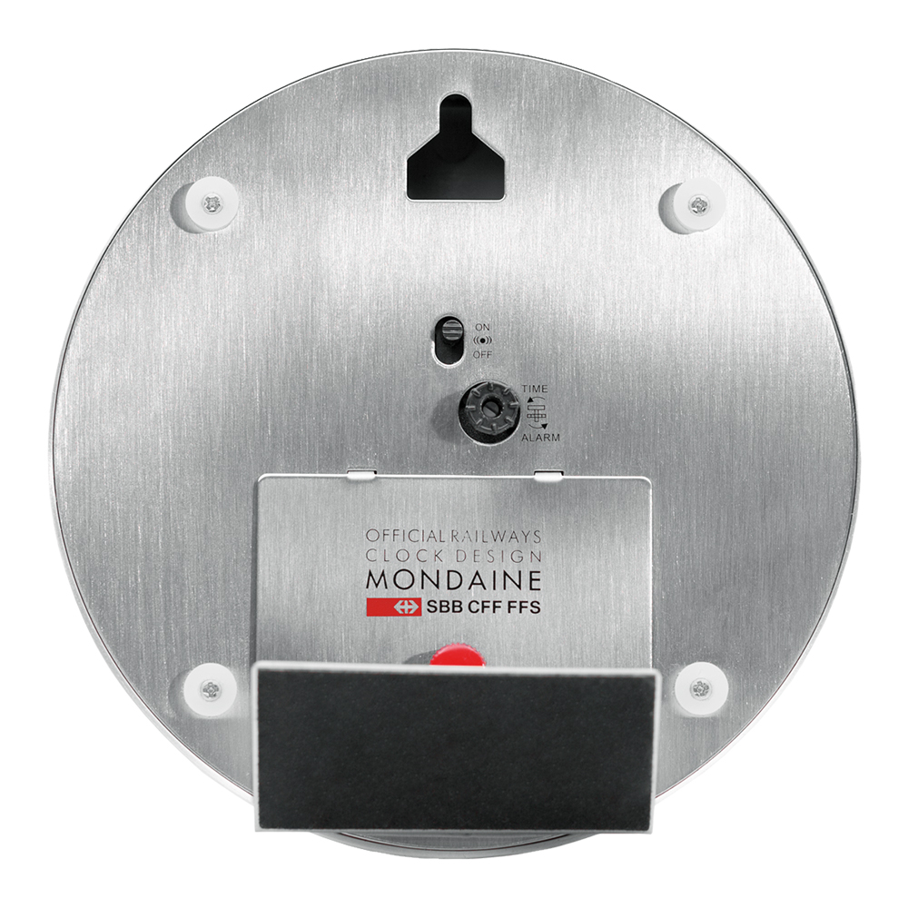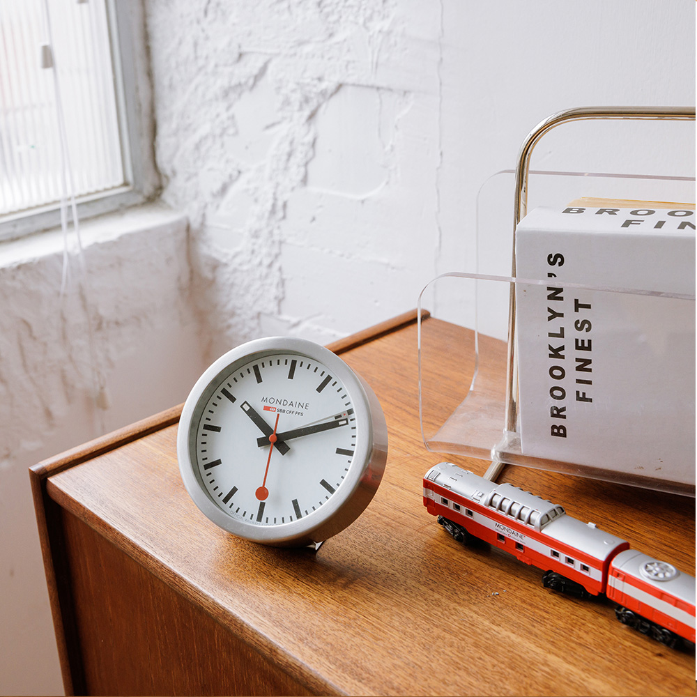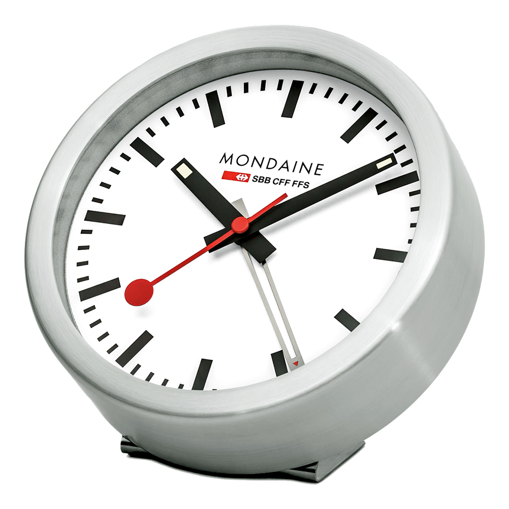 MONDAINE 瑞士國鐵兩用鬧鐘,一貫清楚易讀的鐘面設計,附有鬧鈴功能。恰好的尺寸,可以懸掛在面積較小的牆柱或房間,或使用隨附的L型鋁合金支架,立於桌面作為桌鐘使用,時時刻刻給您最準確的計時。