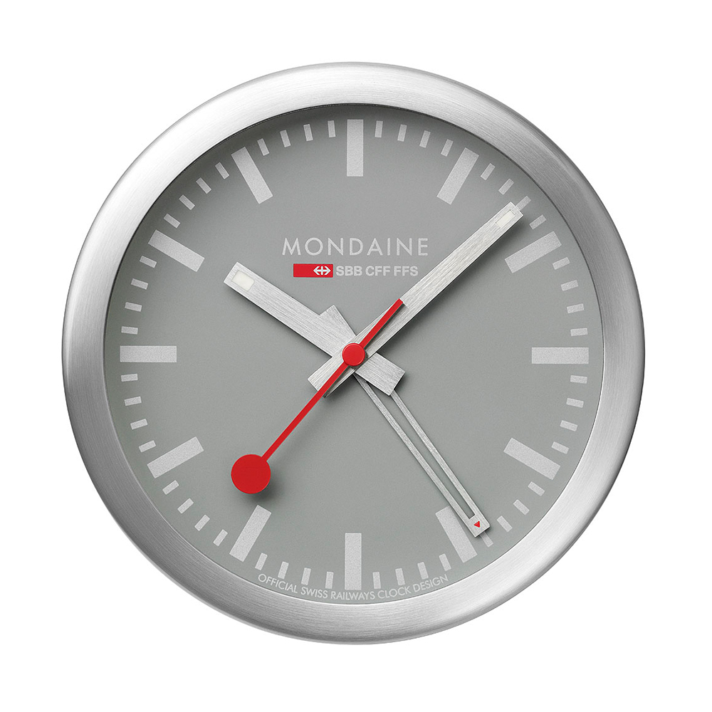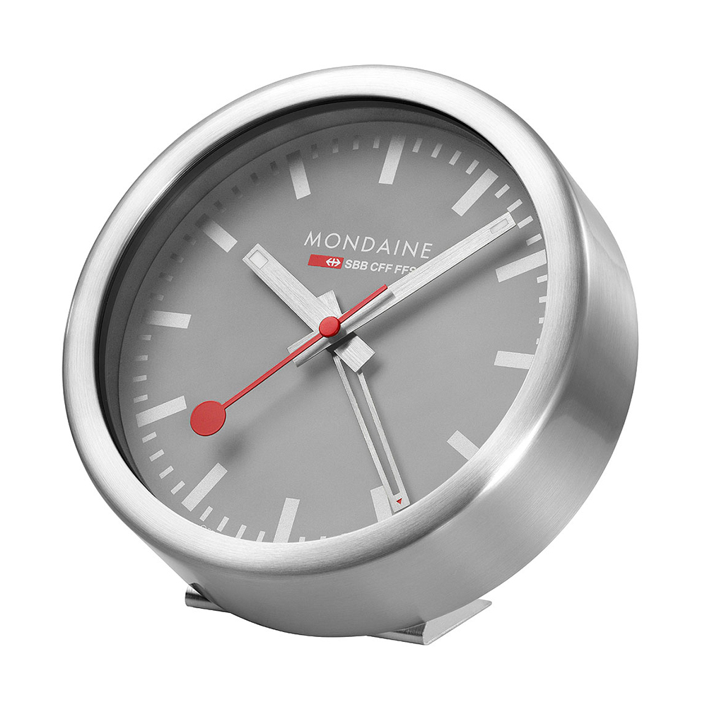 MONDAINE 瑞士國鐵兩用鬧鐘,一貫清楚易讀的鐘面設計,附有鬧鈴功能。恰好的尺寸,可以懸掛在面積較小的牆柱或房間,或使用隨附的L型鋁合金支架,立於桌面作為桌鐘使用,時時刻刻給您最準確的計時。
